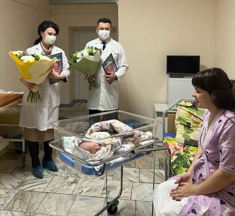 Первый зампред правительства Забайкальского края Андрей Кефер и министр здравоохранения края Оксана Немакина поздравили маму Анастасию Макушеву и новорожденную Есению в перинатальном центре краевой клинической больницы. Девочка родилась второй в этой семье, вес три килограмма 510 грамм, рост 53 сантиметра. На свет Есения появилась в 00.39.