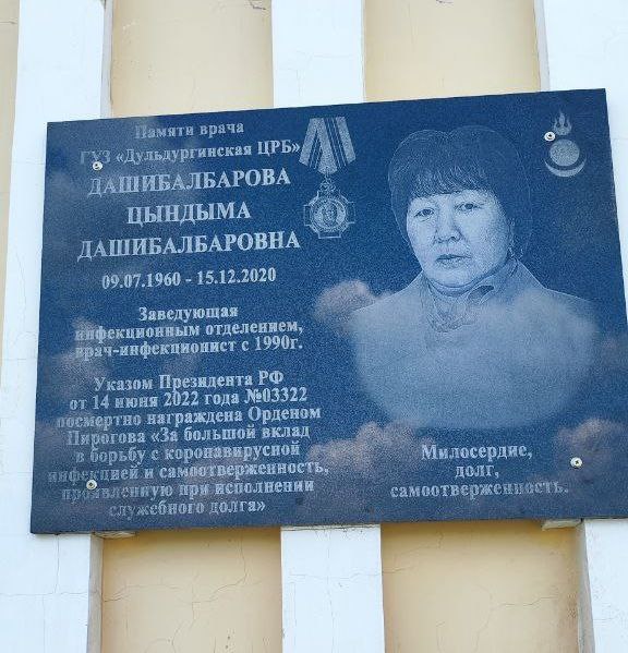 На площадке Дульдургинской центральной районной больницы сегодня, 12 июля, прошла торжественная церемония открытия мемориальной доски врачу-инфекционисту, заведующей инфекционным отделением учреждения Цындыме Дашибалбаровой. Указом Президента России Владимира Путина от 14 июня 2022 года она посмертно награждена Орденом Пирогова «За большой вклад в борьбу с коронавирусной инфекцией и самоотверженность, проявленную при исполнении служебного долга».