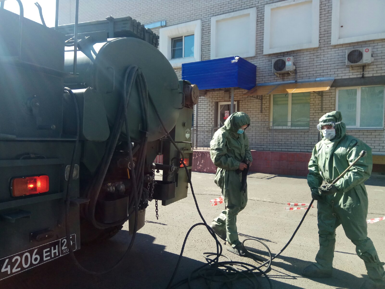 Пока врачи борются за жизнь пациентов, военные - за безопасность самих врачей, медперсонала городской больницы, а вместе с ними и жителей Читы. Две машины с цистернами дезинфицирующего средства - раствор гипохлорида кальция распыляется на подъездные пути, двери, пандусы. Риск переноса инфекции за территорию медучреждения после такой обработки минимальный. Кроме этого, установлены границы заразной и чистой зон. Корпусы огорожены, расставлены предупредительные знаки. Вход только по пропускам.