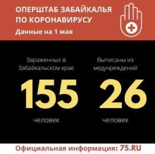 На 1 мая в Забайкалье подтверждено 155 случаев новой коронавирусной инфекции, среди них 20 детей. За сутки зарегистрирован 21 новый случай заражения коронавирусом. Все заболевшие доставлены в медучреждения региона. Всего выздоровело и выписано из больниц 26 человек.