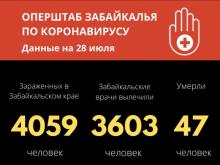 По данным на 28 июля, в Забайкальском крае число случаев заражения коронавирусной инфекцией достигло 4059 (9 за последние сутки). Из них 3603 (87 за сутки) человек вылечены и выписаны из медицинских учреждений. Новых летальных случаев от вируса не зарегистрировано.