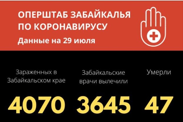 По данным на 29 июля, в Забайкальском крае число случаев заражения коронавирусной инфекцией достигло 4070 (11 за последние сутки). Из них 3645 (42 за сутки) человек вылечены и выписаны из медицинских учреждений. Новых летальных случаев от вируса не зарегистрировано.