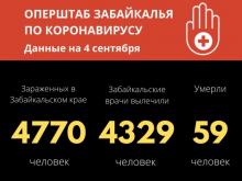 По данным на 3 сентября, в Забайкальском крае число случаев заражения коронавирусной инфекцией достигло 4770 (35 за последние сутки). Из них 4329 (8 за сутки) человек вылечены и выписаны из медицинских учреждений. Количество летальных случаев от вируса - 59.