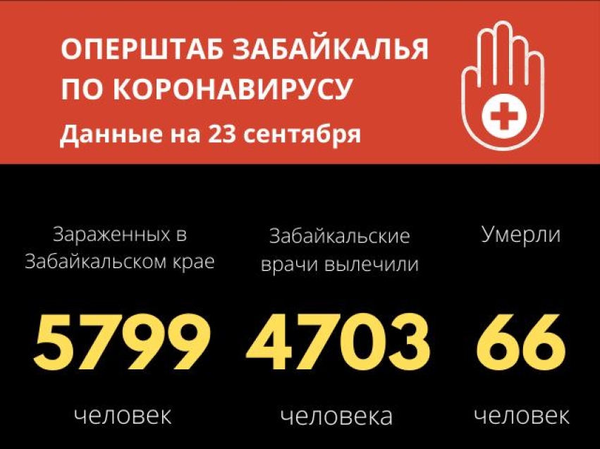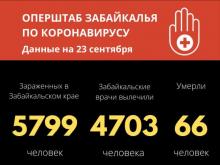 По данным на 23 сентября, число заболевших COVID-19 в Забайкальском крае - 5799 человек. 72 забайкальца оказались больными коронавирусной инфекцией за последние сутки. 4703 (50 за сутки) человек вылечены и выписаны из медицинских организаций. Общее количество летальных случаев – 66.