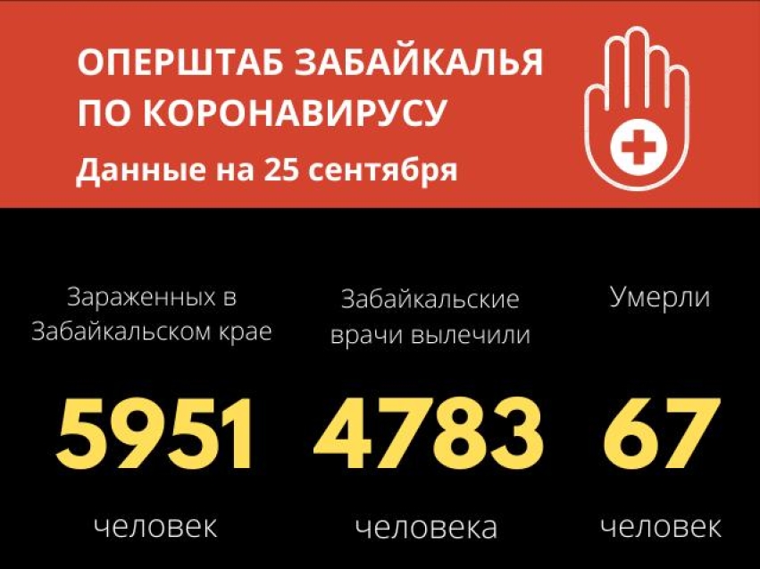 По данным оперативного штаба на 25 сентября, в Забайкальском крае число случаев заражения новой коронавирусной инфекцией достигло 5951 (77 за последние сутки). Из них 4783 (48 за сутки) человек вылечены и выписаны из медицинских учреждений. Общее количество летальных случаев – 67.