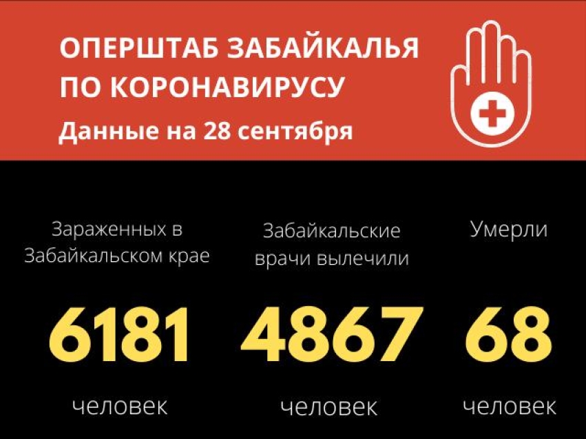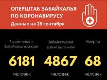 По данным на 28 сентября, в Забайкальском крае число случаев заражения коронавирусной инфекцией достигло 6181 (82 за последние сутки). Из них 4867 (15 за сутки) человек вылечены и выписаны из медицинских учреждений. Общее количество летальных случаев – 68.