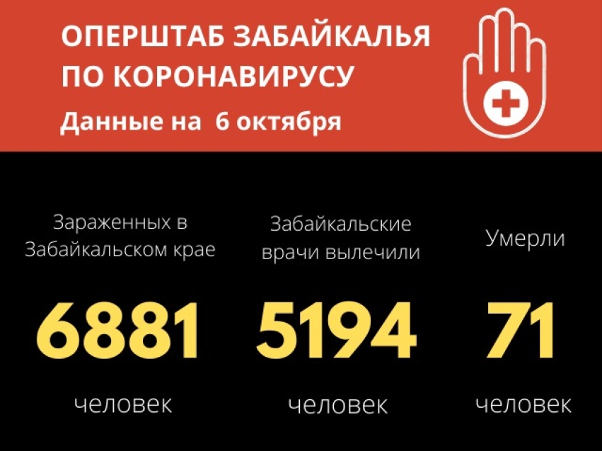 В настоящее время, в Забайкальском крае число случаев заражения коронавирусной инфекцией достигло 6881, из них 5194 (36 за сутки) человек вылечены и выписаны из медицинских учреждений.
