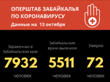 По данным регионального оперштаба на 13 октября, за последние сутки коронавирусной инфекцией заразились еще 173 жителя Забайкальского края. Общее число случаев COVID-19 в регионе достигло 7932.