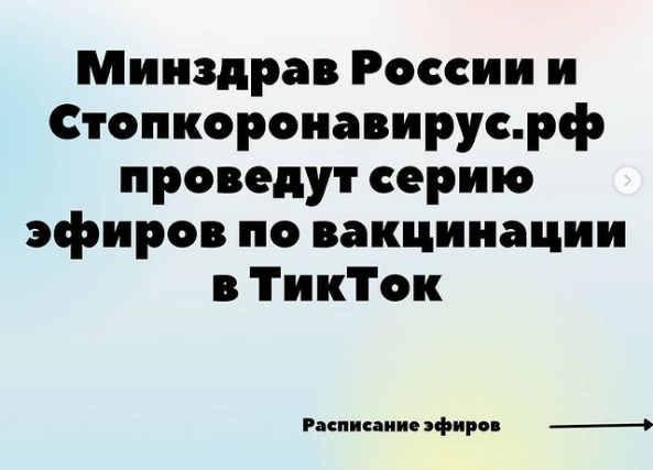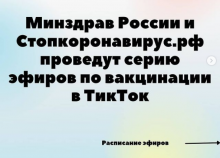 Серия прямых эфиров о вакцинации против COVID-19 пройдет при поддержке Минздрава России на площадке стопкоронавирус.рф в TikTok 22-28 сентября.