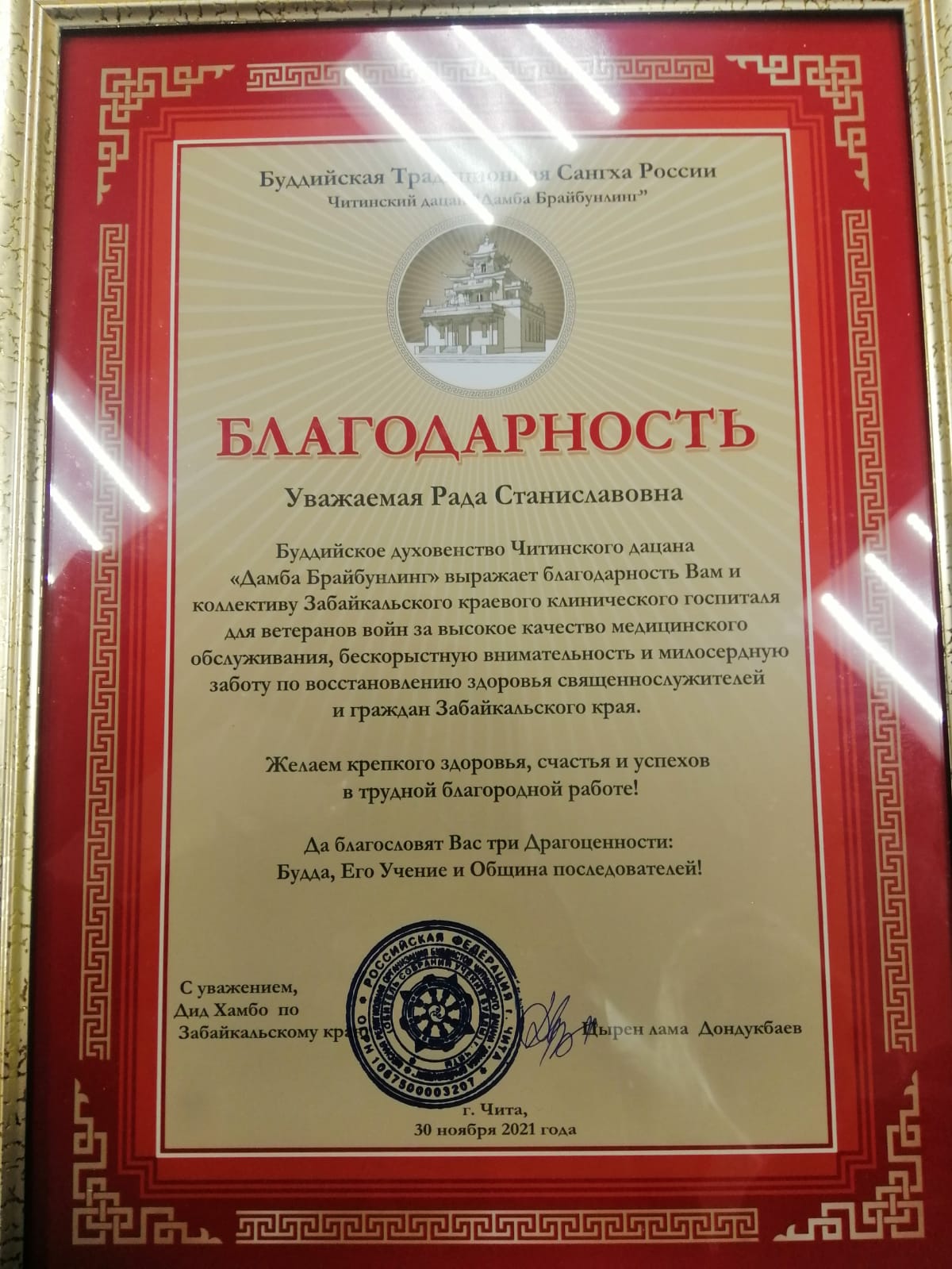 Сегодня в Читинском дацане прошло торжественное освящение двух новых статуй Богини Белой и Зеленой Тары, дарующих здоровье и долголетие всем жителям Забайкалья. Специально для проведения обряда из Агинского дацана приехал Дид Хамбо лама по Забайкальскому краю Цырен Дондукбаев, который вручил благодарственные письма и памятные подарки специалистам госпиталя ветеранов войн.